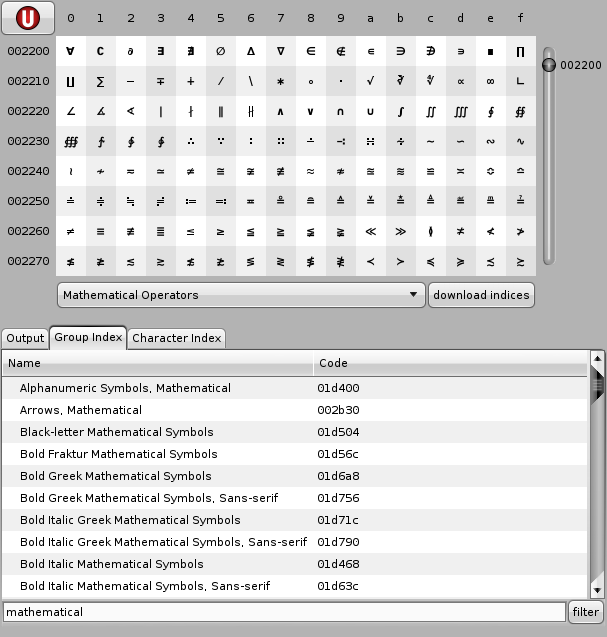Unibrow is a simple unicode character browser that displays all the unicode characters systematically. It is possible to scroll through the characters with the mouse wheel or using the range slider. The characters are presented in a table with their unicode values labelled along the edges. Clicking on a character will insert it into a text buffer beneath the table. This enables basic text composition directly in unibrow, which can then be copied into another destination.